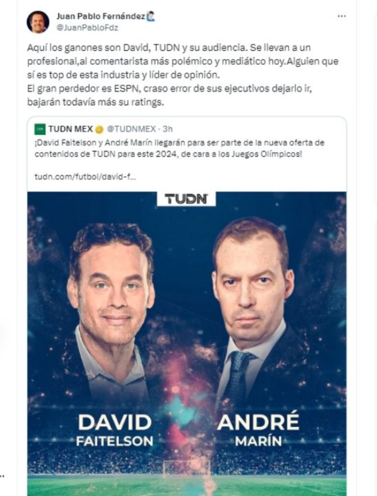 CDMX.- ¡Oficial! David Faitelson fue anunciado como nuevo integrante de TUDN y Christian Martinoli reaccionó en sus redes sociales.