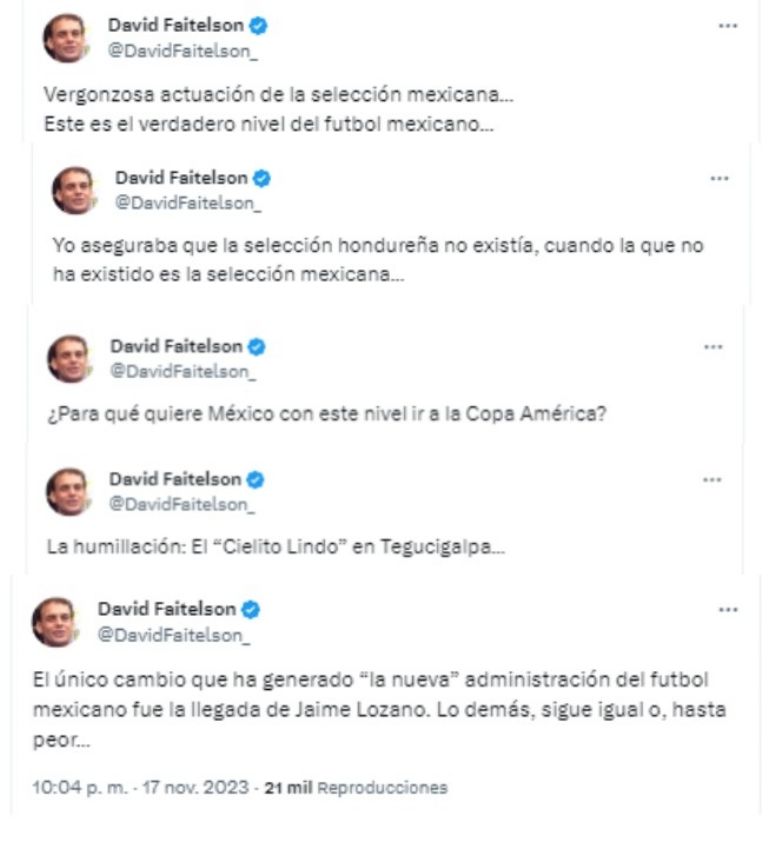 Yo aseguraba que la selección hondureña no existía, cuando la que no ha existido es la Selección Mexicana”, “¿Para qué quiere México, con este nivel, ir a la Copa América?”, escribió en varias publicaciones.