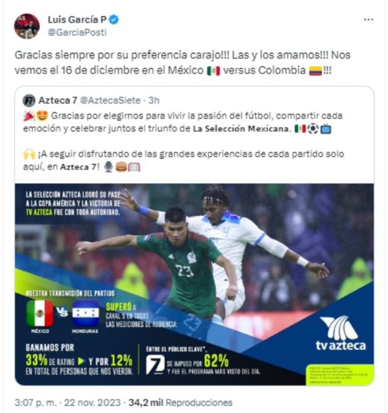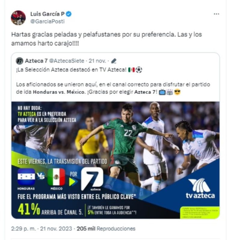 De acuerdo con información de Azteca Deportes, la emisión del partido de ida entre México y Honduras fue “la preferida para ver a la Selección Azteca”, asegurando que Azteca 7 tuvo un 41% más que Canal 5.
