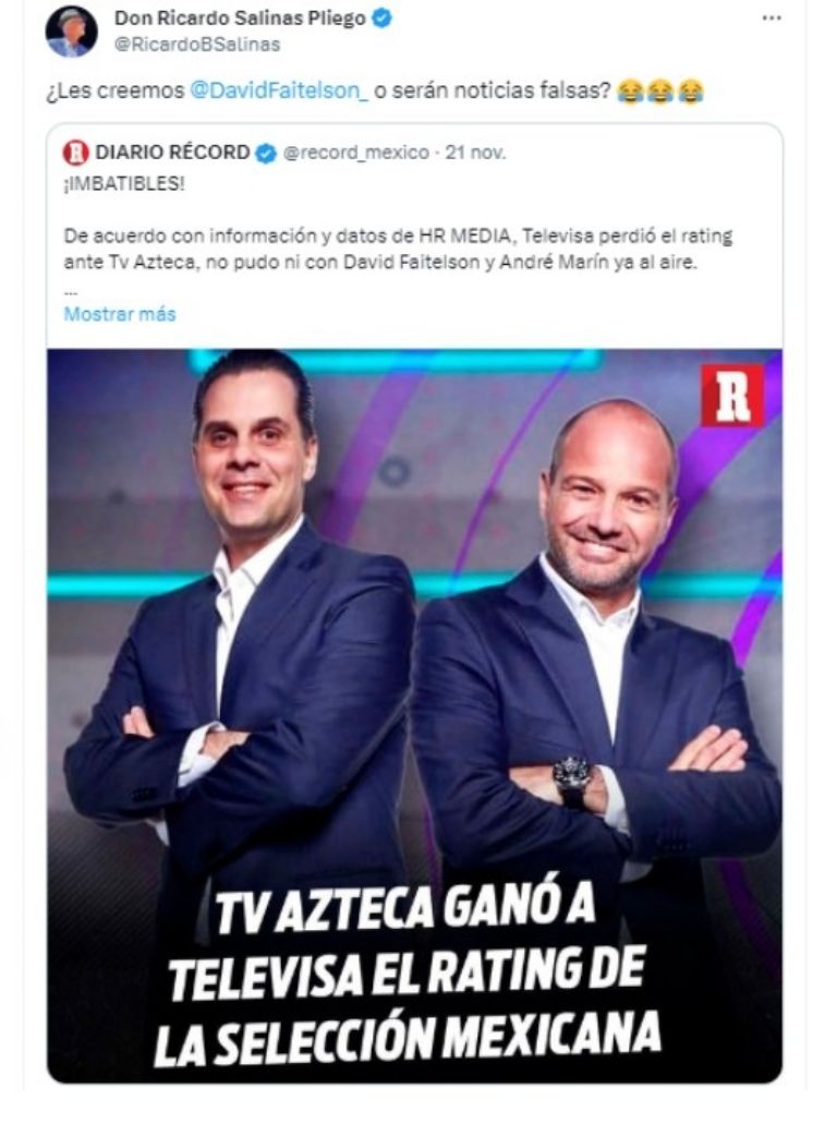 ¿Les creemos David Faitelson o serán noticias falsas?”, escribió Ricardo Salinas Pliego