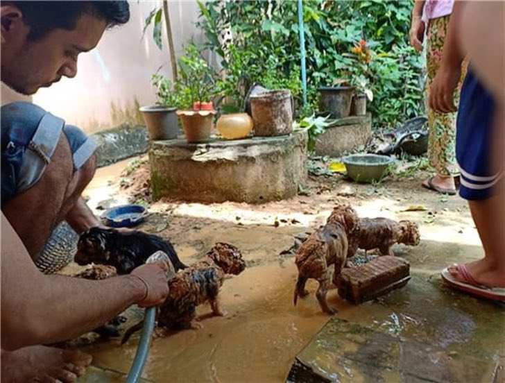 En un inicio Surachet no podía saber que eran pues tenían mucho lodo que no podían respirar. Cuando se dio cuenta que se trataba de canes, los llevó a casa para limpiarlos.