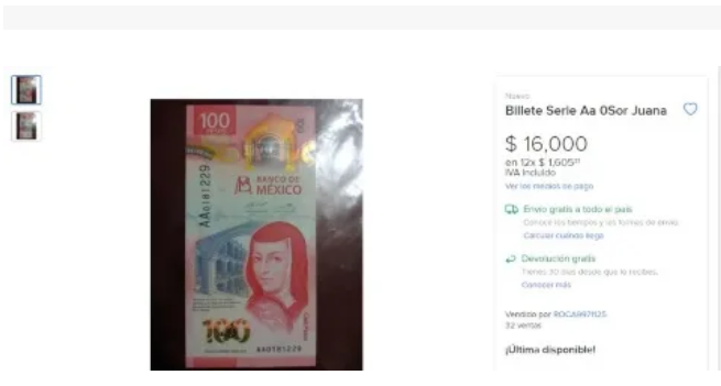 El billete de 100 pesos con la imagen de Sor Juana comenzó a circular desde noviembre del año pasado, pero recientemente su valor ha aumentado entre los coleccionistas hasta los 16 mil pesos.